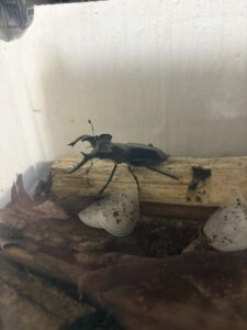 気温が下がると、エネルギーの消費を最小限にしている様子で止まり木の上でじっとして過ごしている時間が長かったですが、最近は気温が少しずつ上がってきたおかげで、天気の良い日には動き回る事も度々見受けられるようになりました。符節の欠損も殆どなく、ゼリーの交換時には警戒して大あごを広げる様子も見られ、まだまだ元気な様子です。(^^♪ この調子で1日でも長く生きてくれる事を願って見守っていこうと思います。